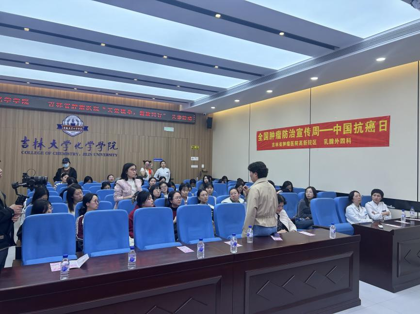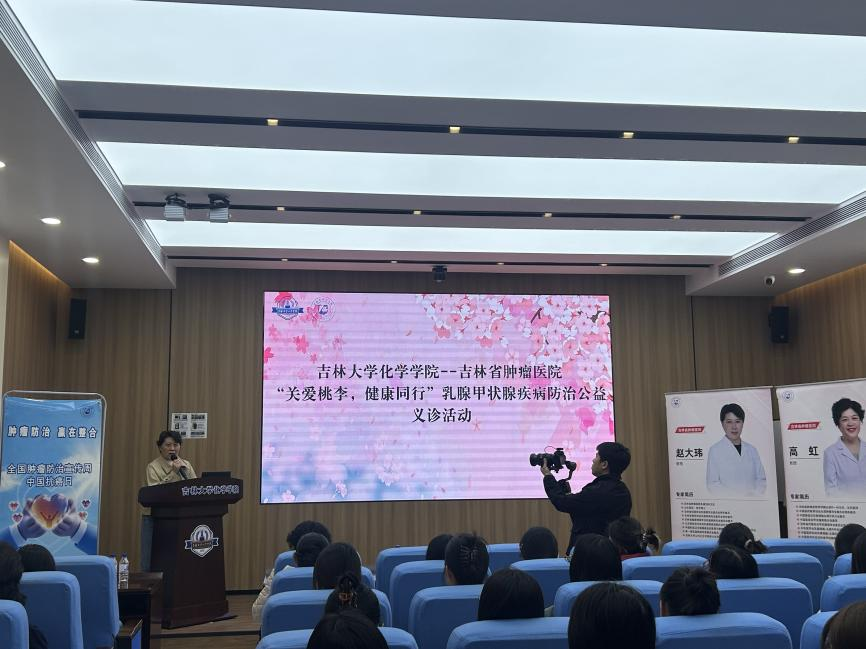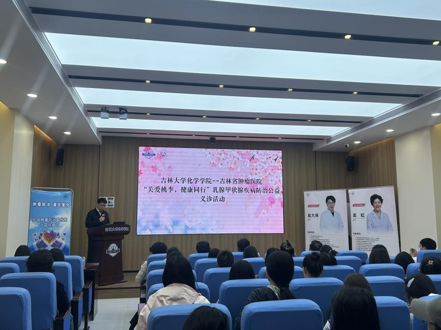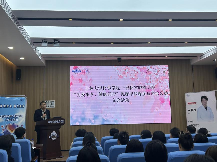 时值第32个全国肿瘤防治宣传周,为关爱女性师生身心健康,提高肿瘤疾病防治意识,4月16日下午,吉林大学化学学院工会、妇委会联合吉林省肿瘤医院举办“关爱桃李,健康同行”乳腺甲状腺疾病防治公益义诊活动。吉林省肿瘤医院乳腺外四科主任赵大玮、甲状腺头颈外一科主任高虹,化学学院党委书记马本华,党委副书记、纪委书记唐宗明参与活动。活动由行政副院长吕博群主持。