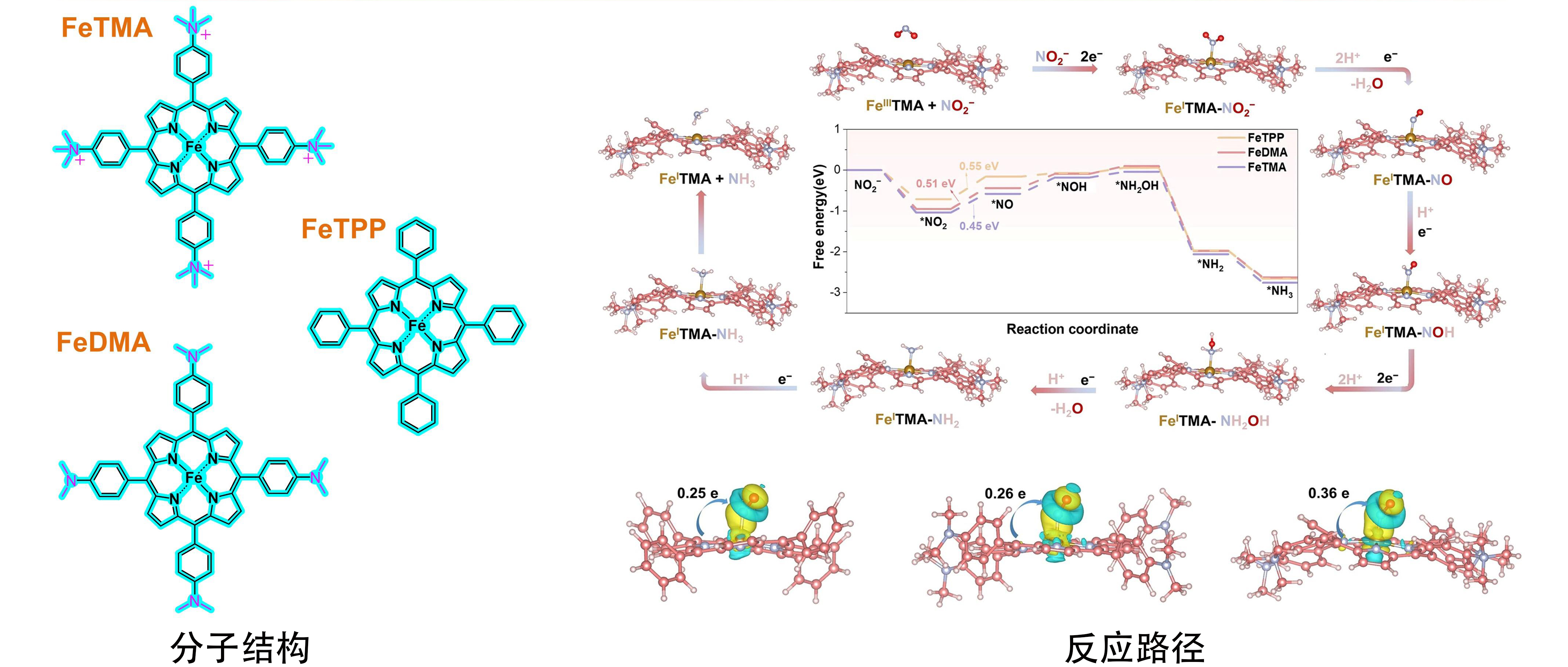 基于上述考虑,饶衡/秦俊生团队报道了一种三甲基氨基阳离子修饰的铁卟啉(FeTMA)并应用于电催化亚硝酸根还原反应。阳离子引入能够降低中心金属的电荷密度进而增强对亚硝酸根的吸附并且还能通过库仑作用促进氨的脱附,最终达到提高反应速率的目的。FeTMA表现出了优异的催化性能,其氨的法拉第效率接近100%,并且氨的峰值产率达到458 µmol h⁻¹ cm⁻²。在相同条件下FeTMA的氨产率分别是铁四苯基卟啉(FeTMA)和二甲基氨基给电子取代基修饰铁卟啉(FeDMA)氨产率的1.5和1.9倍。这说明三甲基氨基阳离子取代基的引入对于增强铁卟啉电催化还原亚硝酸根为氨的催化表现是十分有效的。在均相条件下表征了FeTMA与亚硝酸根的相互作用,测试结果表明FeTMA中FeI是还原亚硝酸根的活性中心。