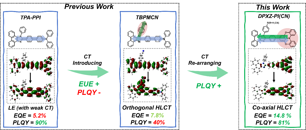 杂化局域电荷转移激发态(HLCT)作为一种有效的分子设计策略,正推动新一代有机电致发光二极管(OLED)领域电致荧光材料的发展。然而,HLCT态的调控是一项需要精密设计的过程:在HLCT中引入电荷转移(CT)激发态组分虽可实现超过理论极限的激子利用效率(EUE),但CT组分也可能降低光致发光量子产率(PLQY),从而不可避免地影响器件的外量子效率(EQE)。为解决这一原理性矛盾,张诗童副教授团队设计合成了两种高效天蓝色HLCT发光分子,并首次提出“共轴HLCT”新概念。其具体的分子设计策略是设计强给体-弱受体的组合,令局域激发态(LE)与CT态在空间分布上呈现共轴状态,降低扭曲自由度对PLQY的不利影响。理论结合实验表征证实“共轴HLCT”结构DPXZ-PI与DPXZ-PICN的强CT特征被抑制,PLQY相较经典HLCT材料TBPMCN实现翻倍增长,因此实现了电致荧光器件性能的突破性提升——最大EQE接近15%,这一结果位居已报道同类材料的领先水平,为HLCT领域分子设计与调控提供了全新的策略。