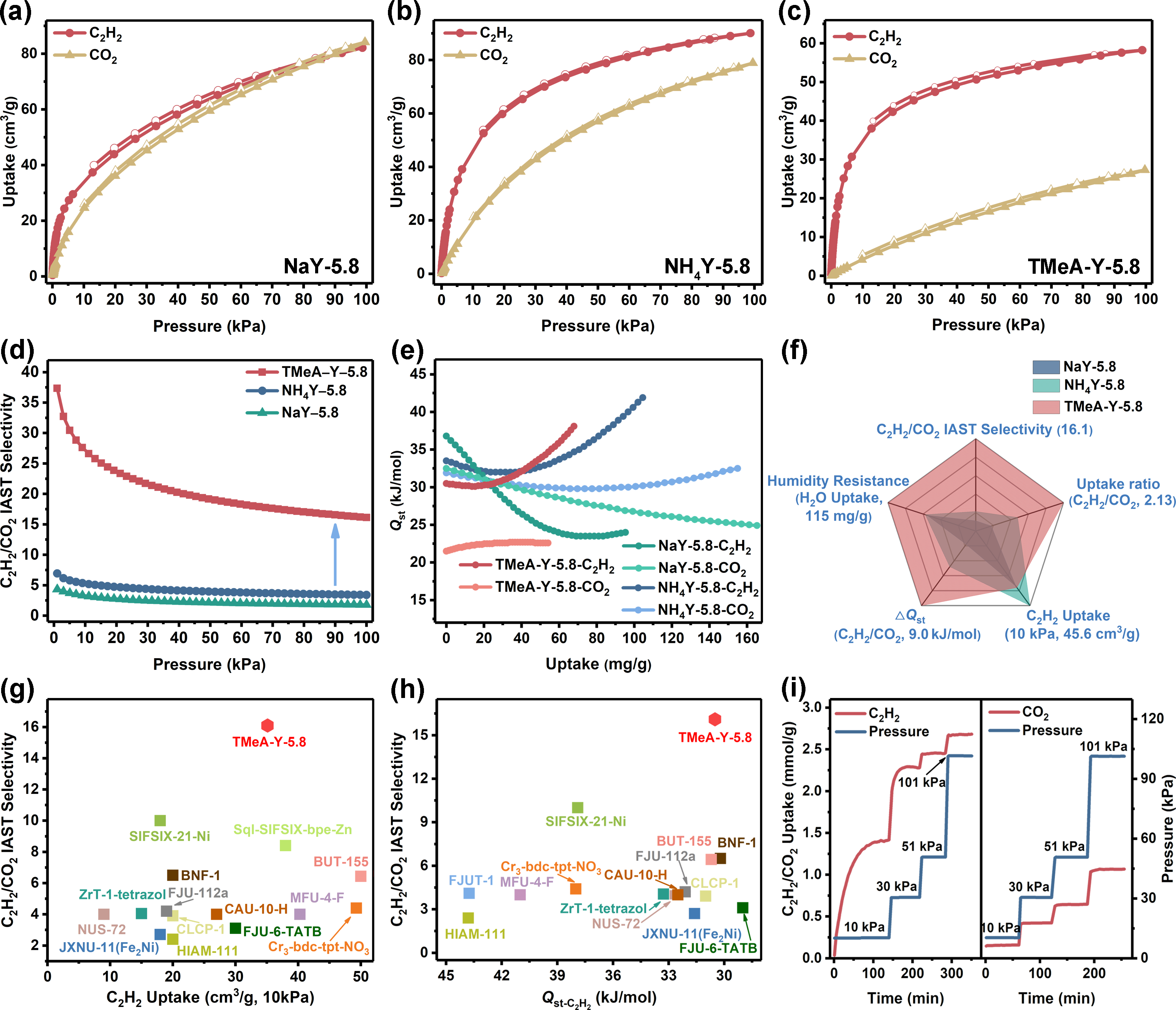 针对上述问题,吉林大学梁志强教授和宋晓伟教授课题组联合天津工业大学梅东海教授,提出通过引入低电荷密度有机阳离子(四甲基铵根离子,TMeA⁺)调控沸石孔道内静电势梯度的新策略,以克服传统弱化学吸附机制的局限,实现高效、低能耗、稳定的C2H2/CO2分离。如图1所示,NaY-5.8和NH4Y-5.8对C2H2和CO2的吸附等温线均为典型的I型,且吸附量接近,表明无选择性。而TMeA-Y-5.8的吸附行为发生根本性转变:C2H2吸附仍为I型,但CO2吸附转变为近乎直线型的准线性等温线。基于吸附等温线,通过理想吸附溶液理论(IAST)预测的C2H2/CO2(50/50)混合气选择性显示,TMeA-Y-5.8的选择性上升至16.1,超过了NaY-5.8(1.79)和NH₄Y-5.8(3.41)。雷达图和性能对比图进一步表明,其综合性能(选择性、吸附量)超过了众多已报道的MOFs、COFs等材料。C2H2和CO2在TMeA-Y-5.8上的吸附动力学曲线表明,虽然CO2初始吸附速率略快,但其平衡吸附量远低于C2H2。这证明分离机制主要源于热力学平衡差异,而非动力学扩散筛分。在基准条件(C2H2/CO2/Ar = 10/5/85)下,TMeA-Y-5.8的C2H2穿透时间长达40.85 min/g,而CO₂几乎紧随载气Ar穿透(3.54 min/g),形成了宽阔的分离平台(如图2所示)。其动态分离因子高达13.1,与静态IAST预测值(16.1)吻合,显著优于NaY-5.8(3.27)和NH₄Y-5.8(4.45)。除此之外,TMeA-Y-5.8具备优异的操作弹性、低能耗再生能力和抗杂质干扰能力。从DFT计算,差分电荷密度分析以及相对介电常数等多角度进一步验证了静电势梯度调控机制。本研究证实通过调节沸石孔道内静电势梯度可实现对相似物理性质气体的高效识别与分离,为今后设计高性能沸石吸附剂提供了新的理论思路和材料平台。