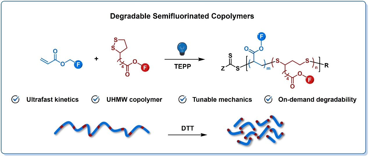 含氟丙烯酸酯聚合物因具有优异的疏水性、化学稳定性及生物相容性,在防护涂层、光学薄膜及生物医学领域应用广泛。然而,传统可控自由基聚合技术在合成含氟聚合物时面临诸多挑战:反应通常依赖金属催化剂、对氧气敏感、聚合速率慢且难以实现超高分子量的精确制备。更为关键的是,全碳主链结构使其难以降解,带来了潜在生态风险。因此,如何在保持高性能的同时赋予含氟聚合物可控降解能力,成为该领域亟待解决的关键问题。
