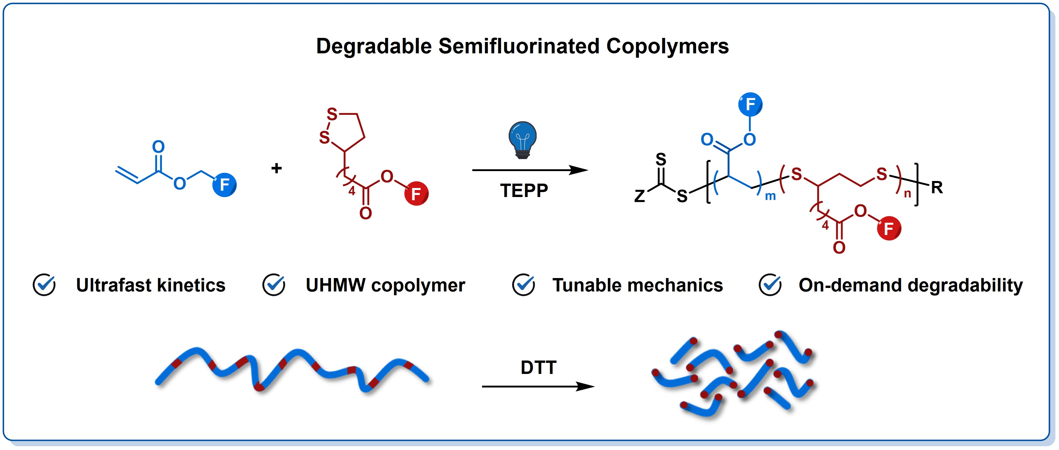 含氟丙烯酸酯聚合物因具有优异的疏水性、化学稳定性及生物相容性,在防护涂层、光学薄膜及生物医学领域应用广泛。然而,传统可控自由基聚合技术在合成含氟聚合物时面临诸多挑战:反应通常依赖金属催化剂、对氧气敏感、聚合速率慢且难以实现超高分子量的精确制备。更为关键的是,全碳主链结构使其难以降解,带来了潜在生态风险。因此,如何在保持高性能的同时赋予含氟聚合物可控降解能力,成为该领域亟待解决的关键问题。